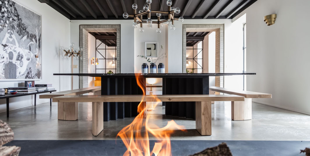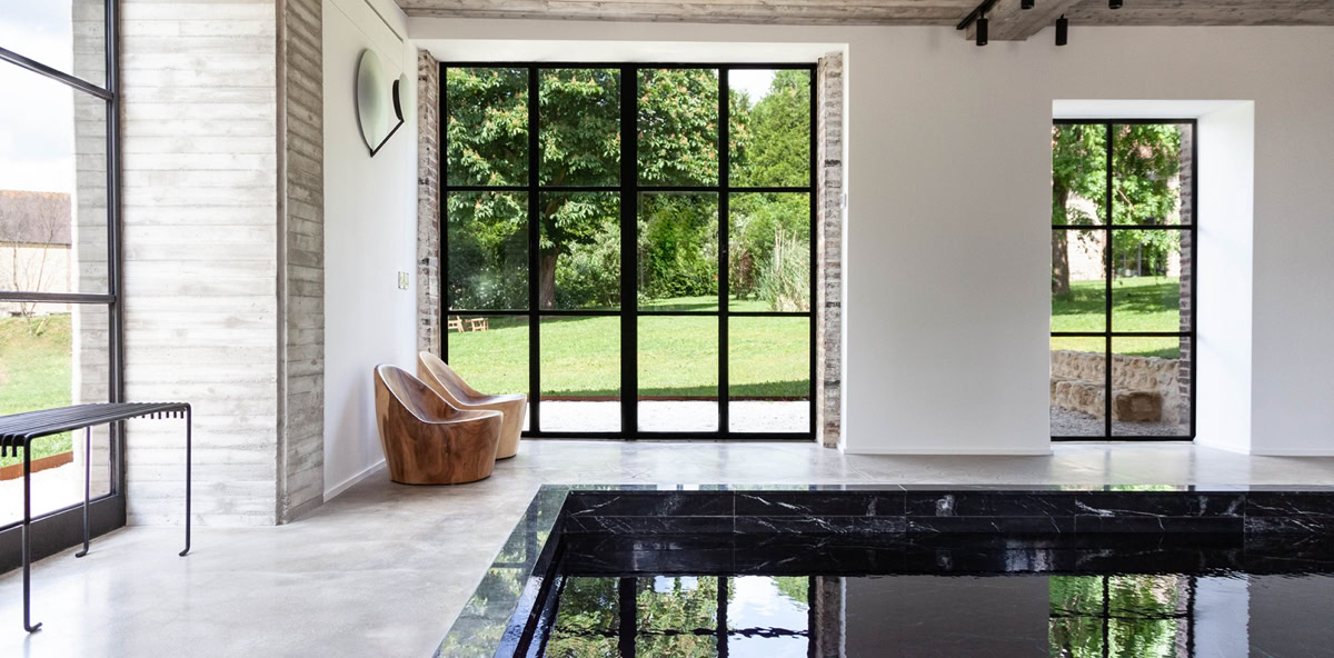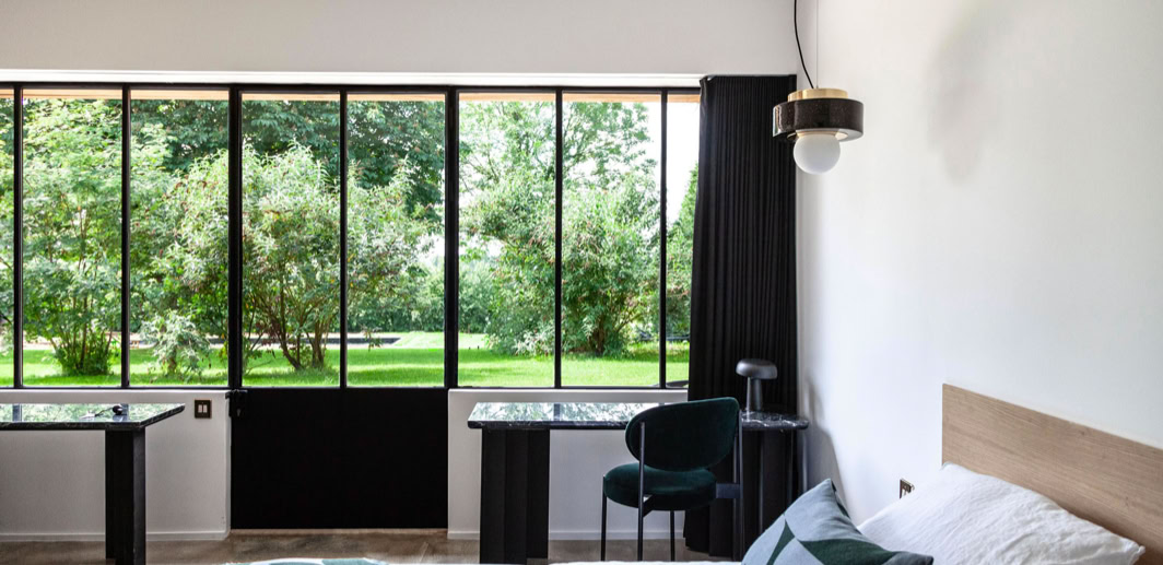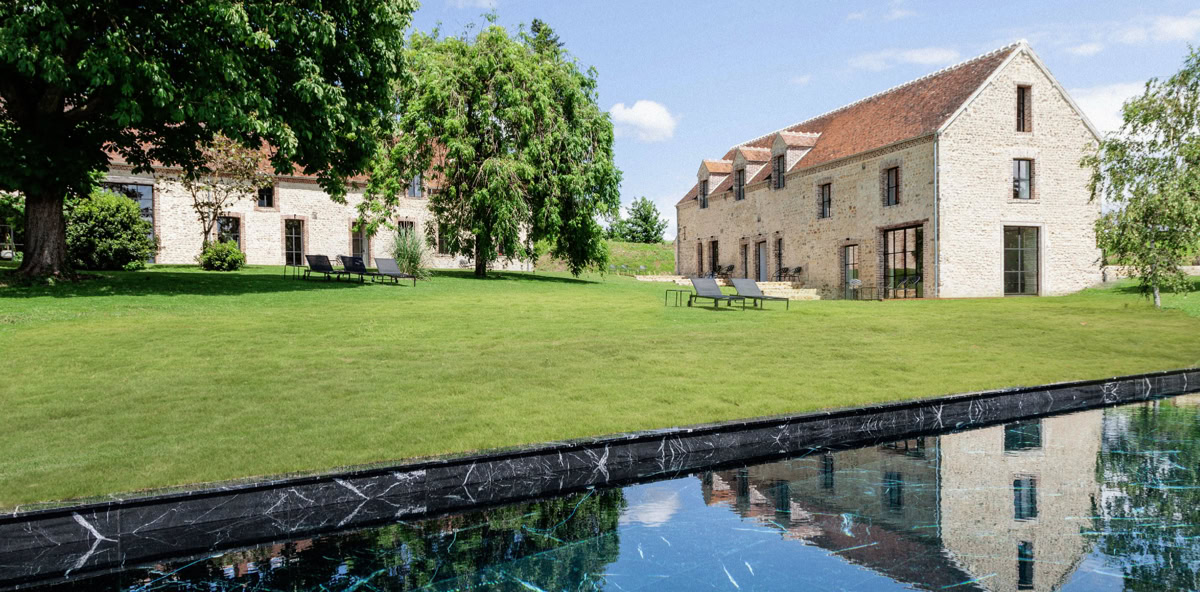"Entourée d'un parc de deux hectares, cette maison de campagne est la destination rêvée cumule les atouts : une piscine en marbre sombre au bord de laquelle se prélasser, un enclos à chevaux et une bonne table où l'on cuisine exclusivement des produits locaux et de saison"
